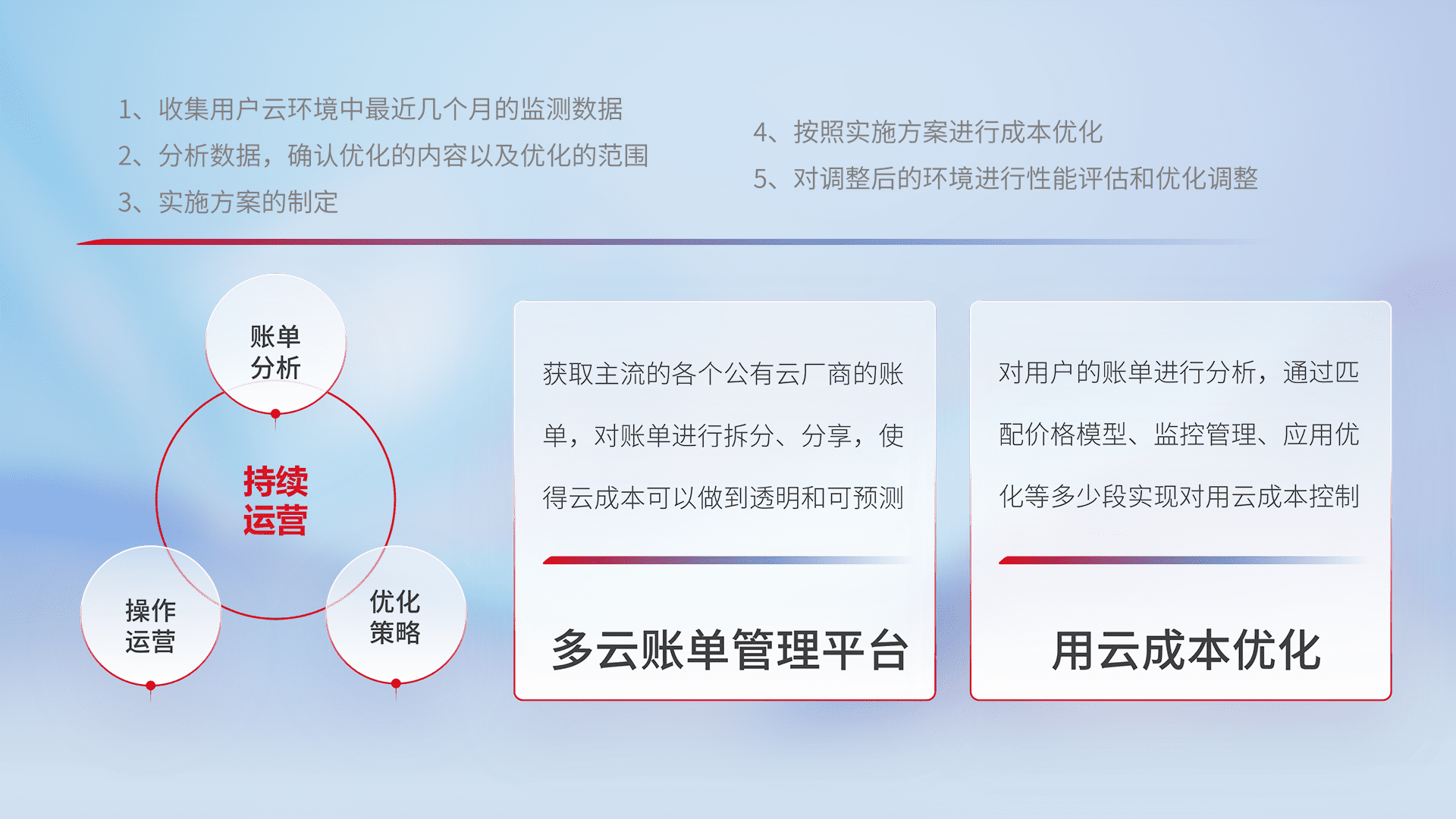 通过多云纳管,,以统一的资源数据模型把客户的云资源进行抽象和封装,,,进而实现对多云资源的统一操作,,,,保障云资源管理的可靠性、、稳定性与可用性。。。。量身定制化运维内容,,,,配置、、、、开发运维、、、、补丁管理、、备份、、、、监控、、、、认证和访问管理、、审计和日常巡检等,,,,保障在用云过程中的可靠度,,,,稳定度以及高可用率。。。