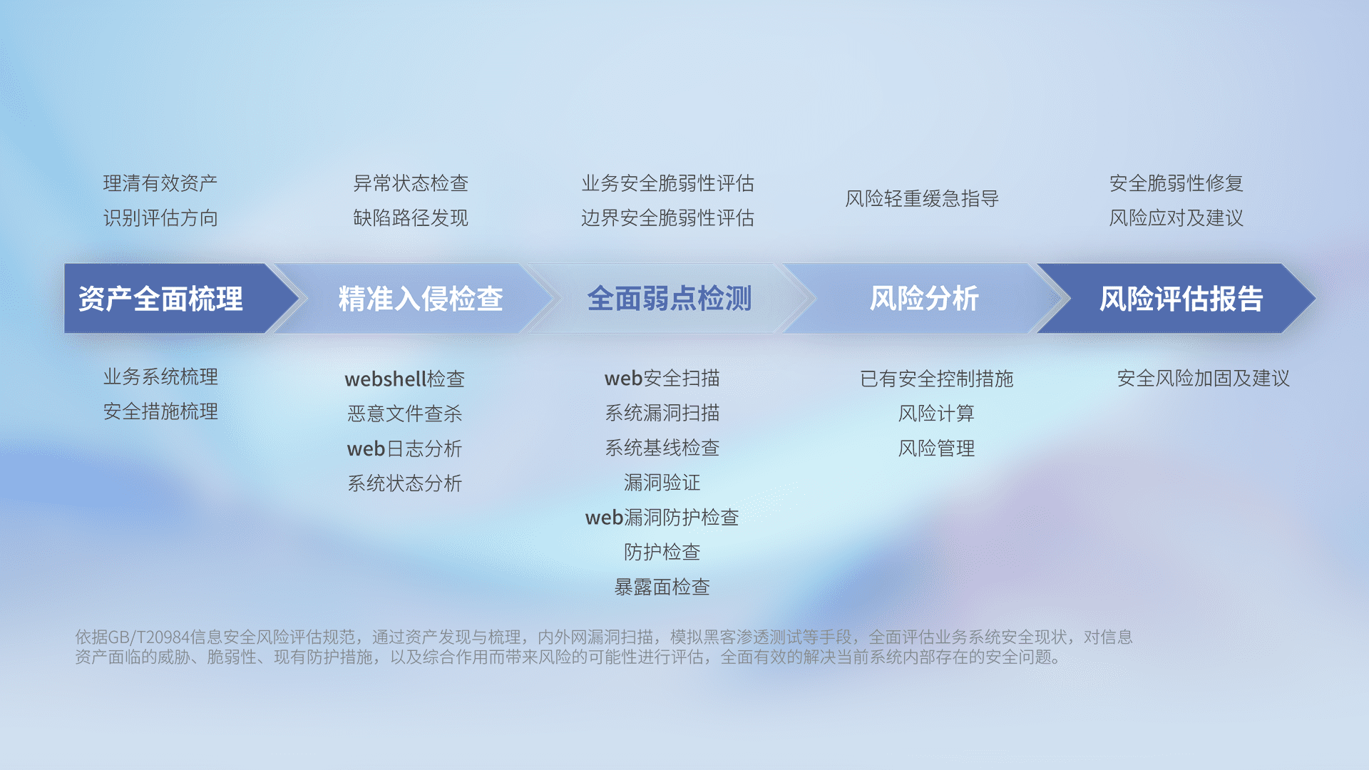 针对客户行业特性,,以专业的安全服务+多厂商联合解决方案提供专属的一站式安全管理服务,,帮助客户全面感知网络空间威胁,,,基于识别、、检测、、分析、、防护、、、监测、、、、响应的服务理论模型,,从方案咨询、、、集成交付、、、评估验证、、、、优化加固、、运维运营,,致力于为客户提供完整的闭环管理式安全服务。。以实战经验为客户打造高抵御风险的安全体系,,帮助客户发现威胁、、对抗威胁、、处置威胁,,,,不断积累安全对抗能力,,,持续保障数字化安全。。