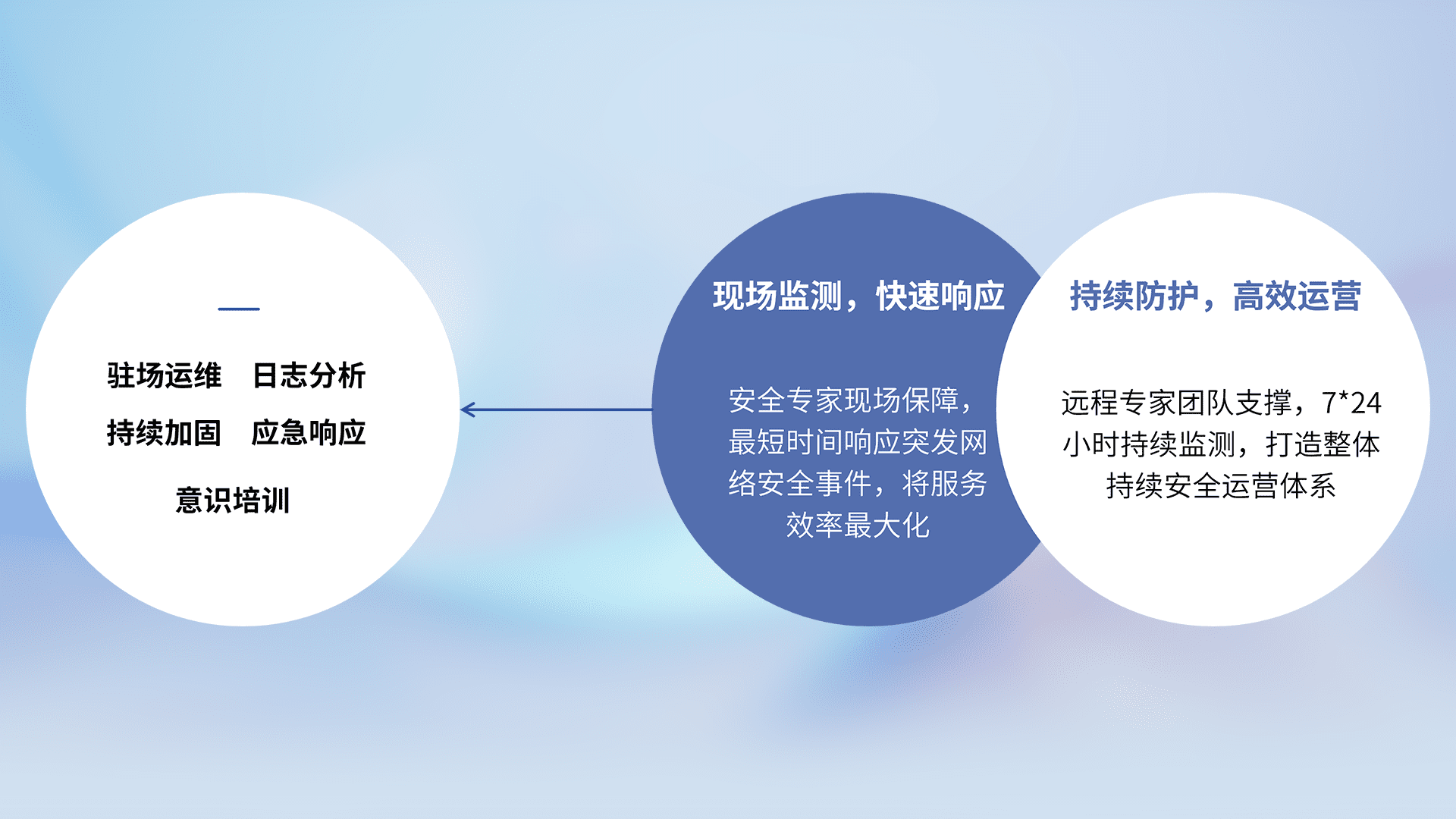 针对客户行业特性,,,,提供专属的一站式安全管理服务,,,,帮助客户全面感知网络空间威胁,,,,通过安全专家的线上、、、、线下防护支持,,,实现风险闭环,,,,将安全保障常态化,,,为客户打造常态化安全运维运营服务。。。。